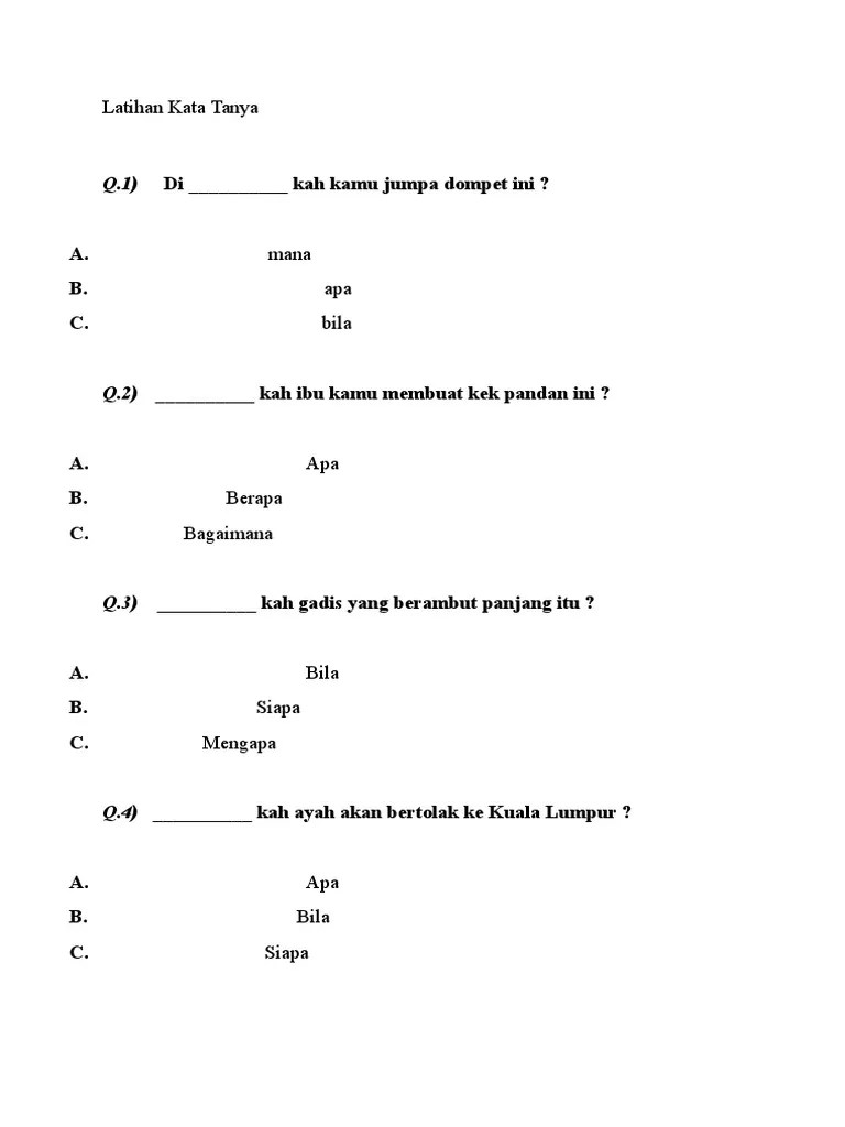 Soalan Latihan Kata Tanya Tahun 2 : Latihan Peribahasa Tahun 5. Tatabahasa soalan melibatkan kata nama, kata seru dan kata tanya serta kata adjektif id: Format dan contoh surat rasmi; Pembunuhan altantuya shaariibuu ialah kes pembunuhan berprofil tinggi yang berlaku di malaysia.dalam kes ini, seorang rakyat mongolia, altantuya shaariibuu dibunuh secara kejam di kawasan berdekatan shah alam, selangor, malaysia.enam orang ditahan dan disiasat berhubung dengan kejadian ini.